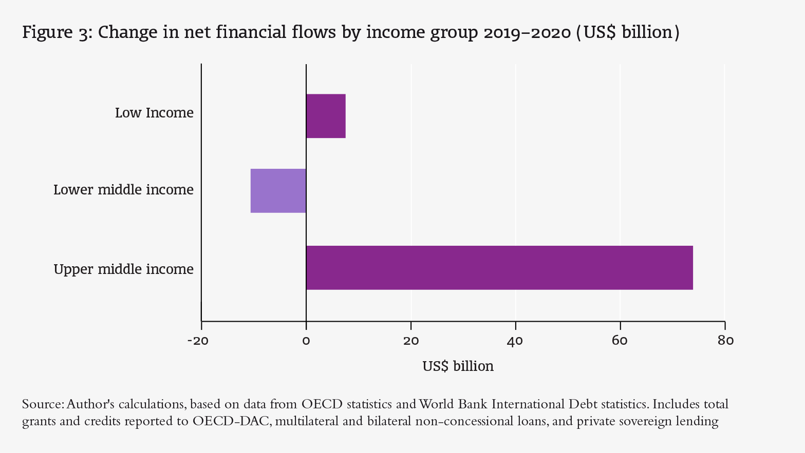 In the immediate aftermath of the pandemic, there was considerable alarmism about a ‘sudden stop’ of capital flows to developing countries. While there was an outflow of over US$ 100 billion in private portfolio capital during the first five months of the crisis3, the situation proceeded to stabilise. By the end of 2020, most components of capital flows to developing countries had increased compared to 2019: grants, official loans and sovereign lending all rose. Multilateral institutions, in particular, scaled up their financing, nearly doubling the volume of loans to developing countries relative to 2019 levels.