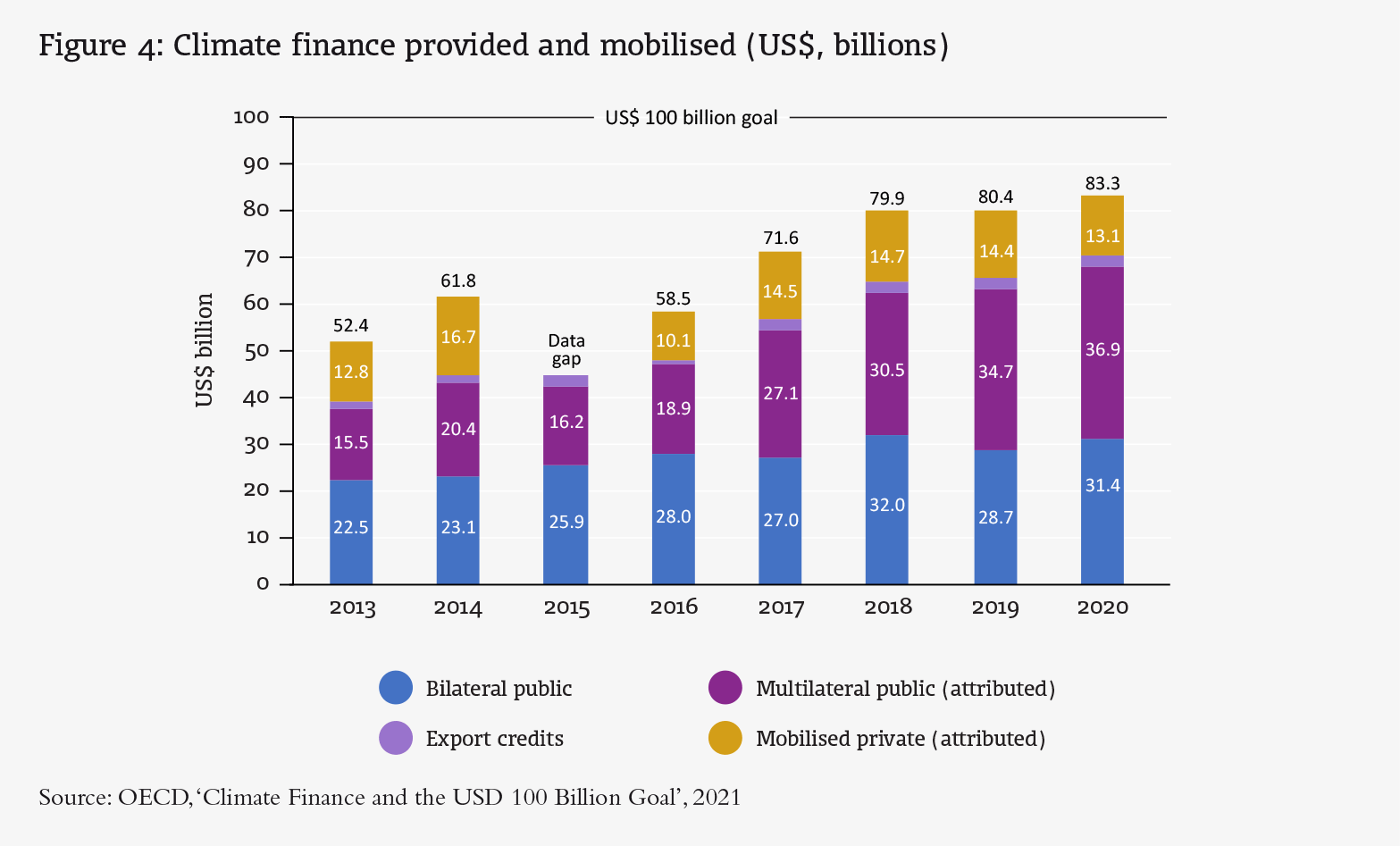 At the Copenhagen Summit in 2009, rich countries pledged to channel US$ 100 billion in annual climate finance to developing countries by 2020. The latest report from the OECD shows a significant shortfall: climate finance was just above $83 billion (see Figure 4 below) in 2020.5 Most of this came through multilateral channels (attributed to rich countries in proportion to their share of capital in each institution), with significant amounts also recorded for bilateral country programs.