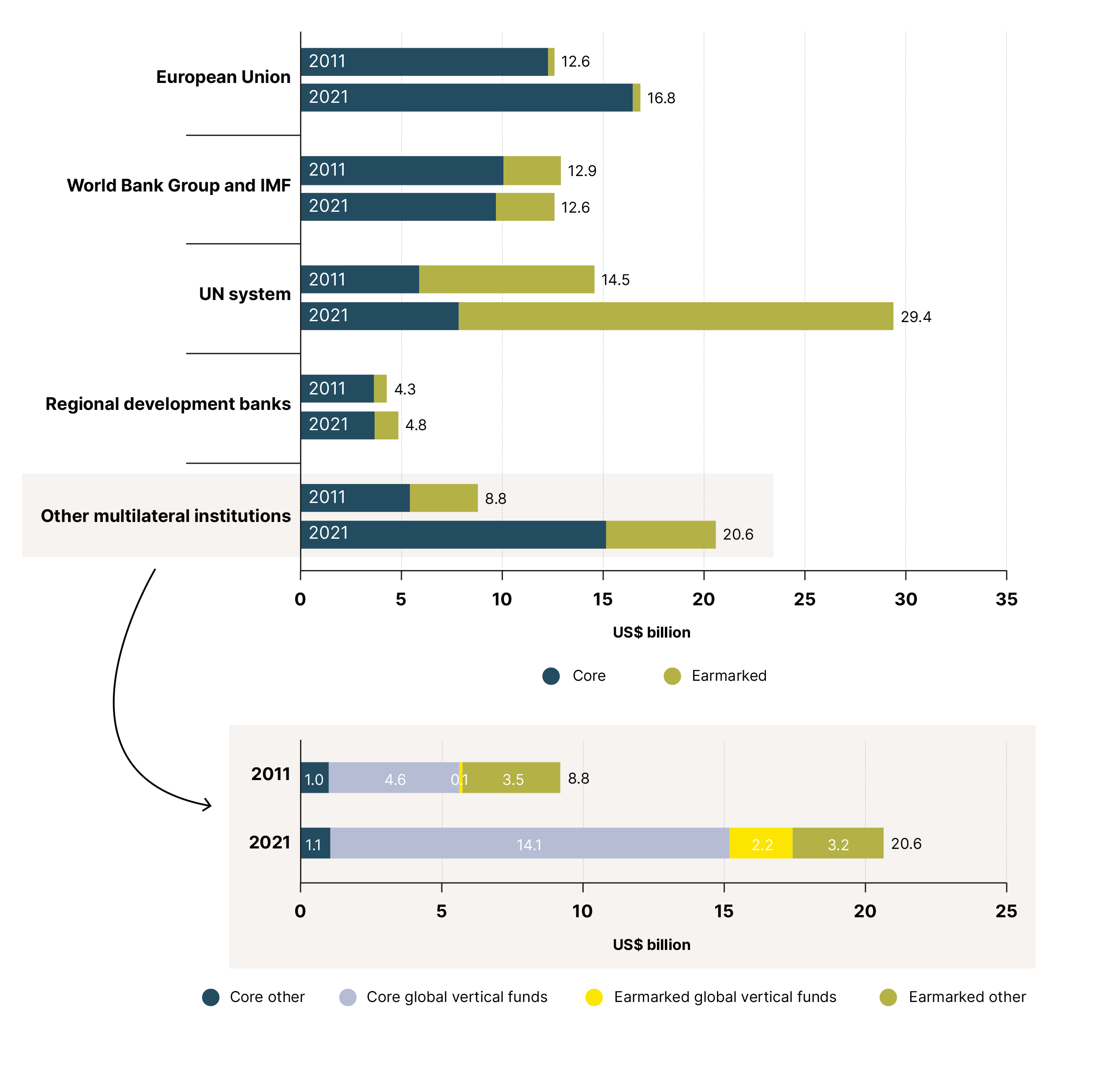 Channels of multilateral assistance from OECD-DAC countries, core and earmarked, 2011 and 2021 (US$ billion)