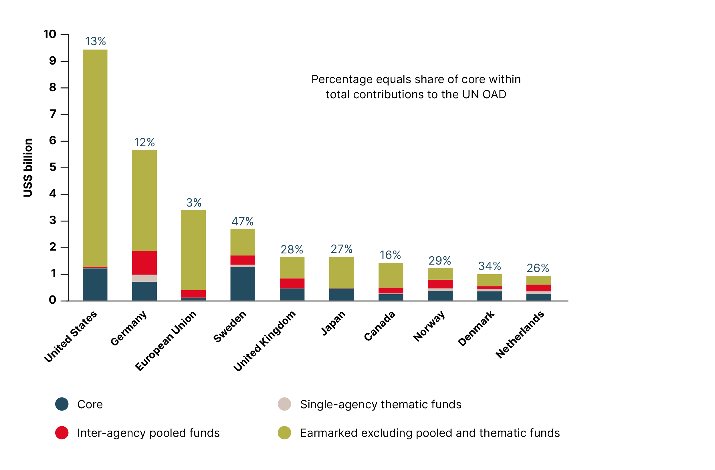 Funding mix of top 10 OECD-DAC members that contribute to UN OAD, 2021 (US$ billion)