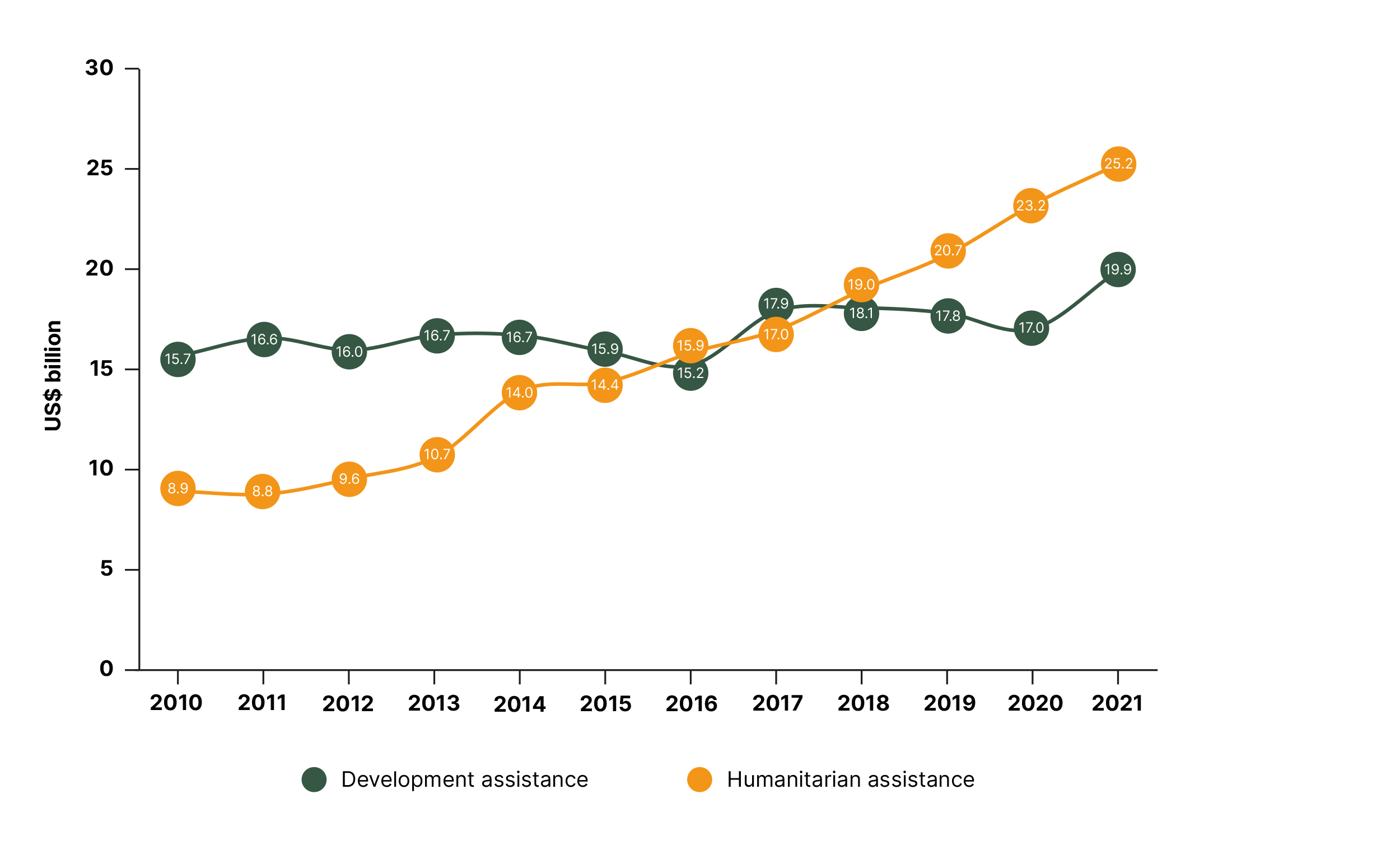 Total UN expenditure for development and humanitarian assistance (UN OAD), 2010–2021 (US$ billion)