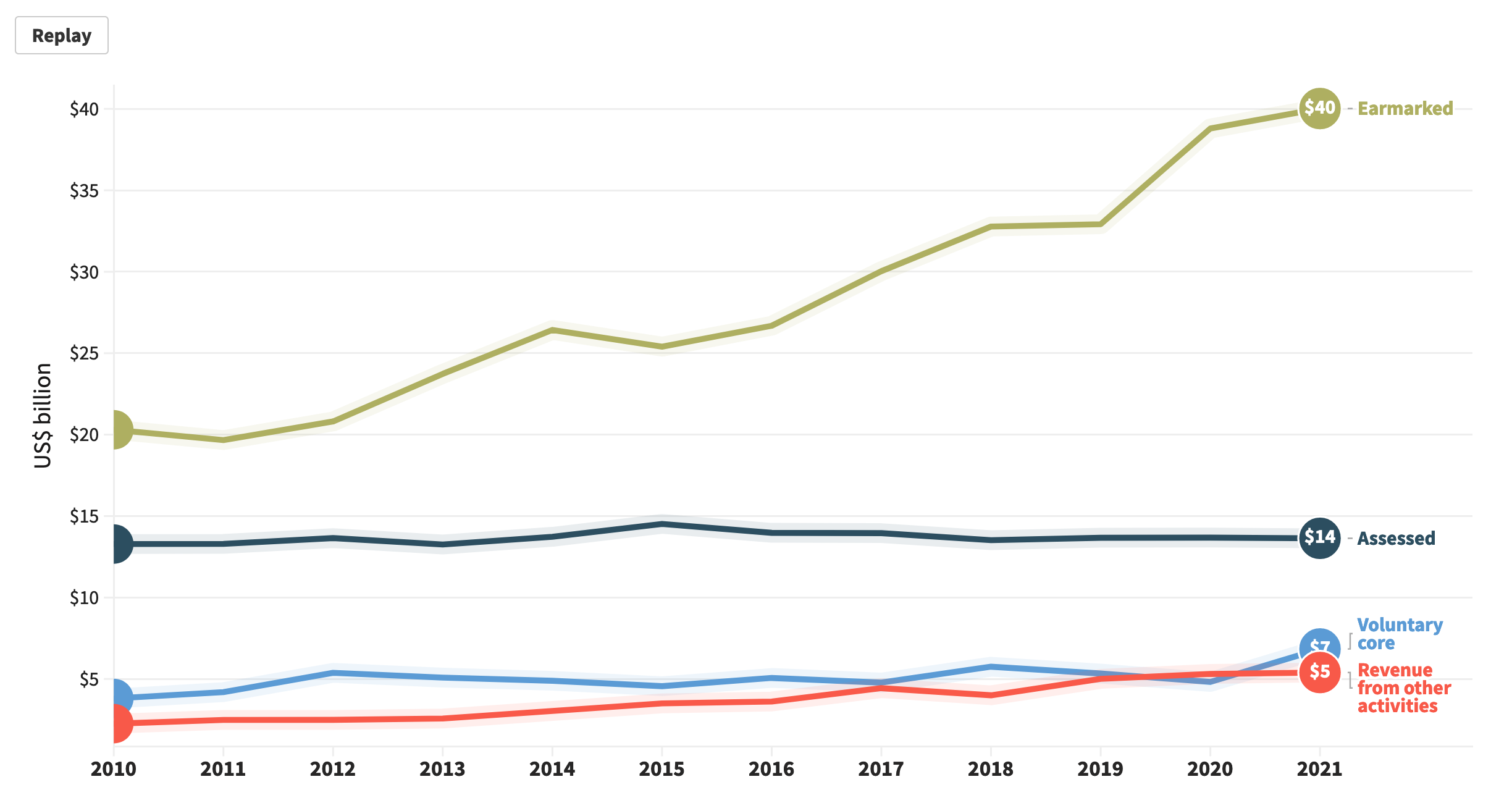 Distribution of total UN system funding by financing instrument, 2010-2021